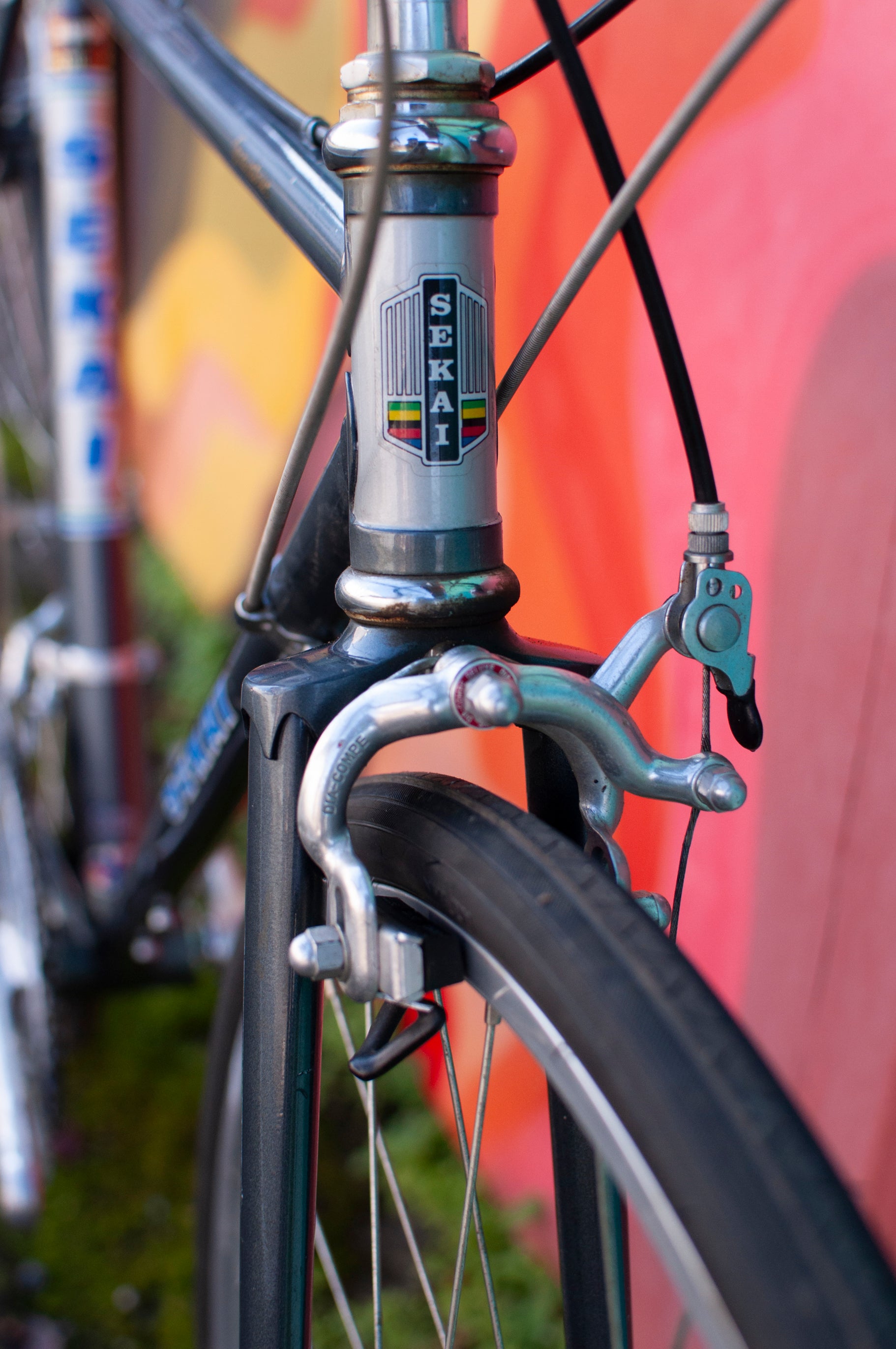 Dia Compe caliper rim brakes and drilled road levers. Levers no longer have rubber hoods however these can be replaced if desired.