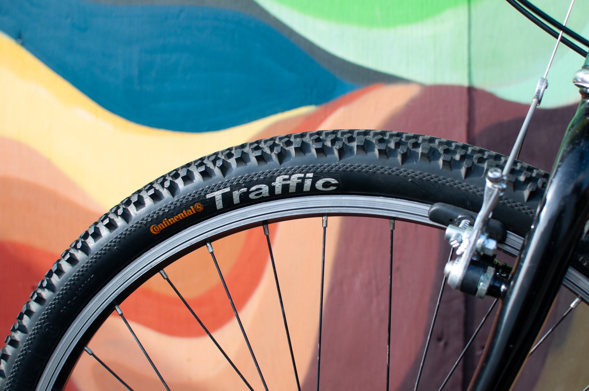 26x2.1" Black Continental "Traffic" tires - textured tread with a fairlly smooth center line for comfortable riding on roads, gravel and trails.