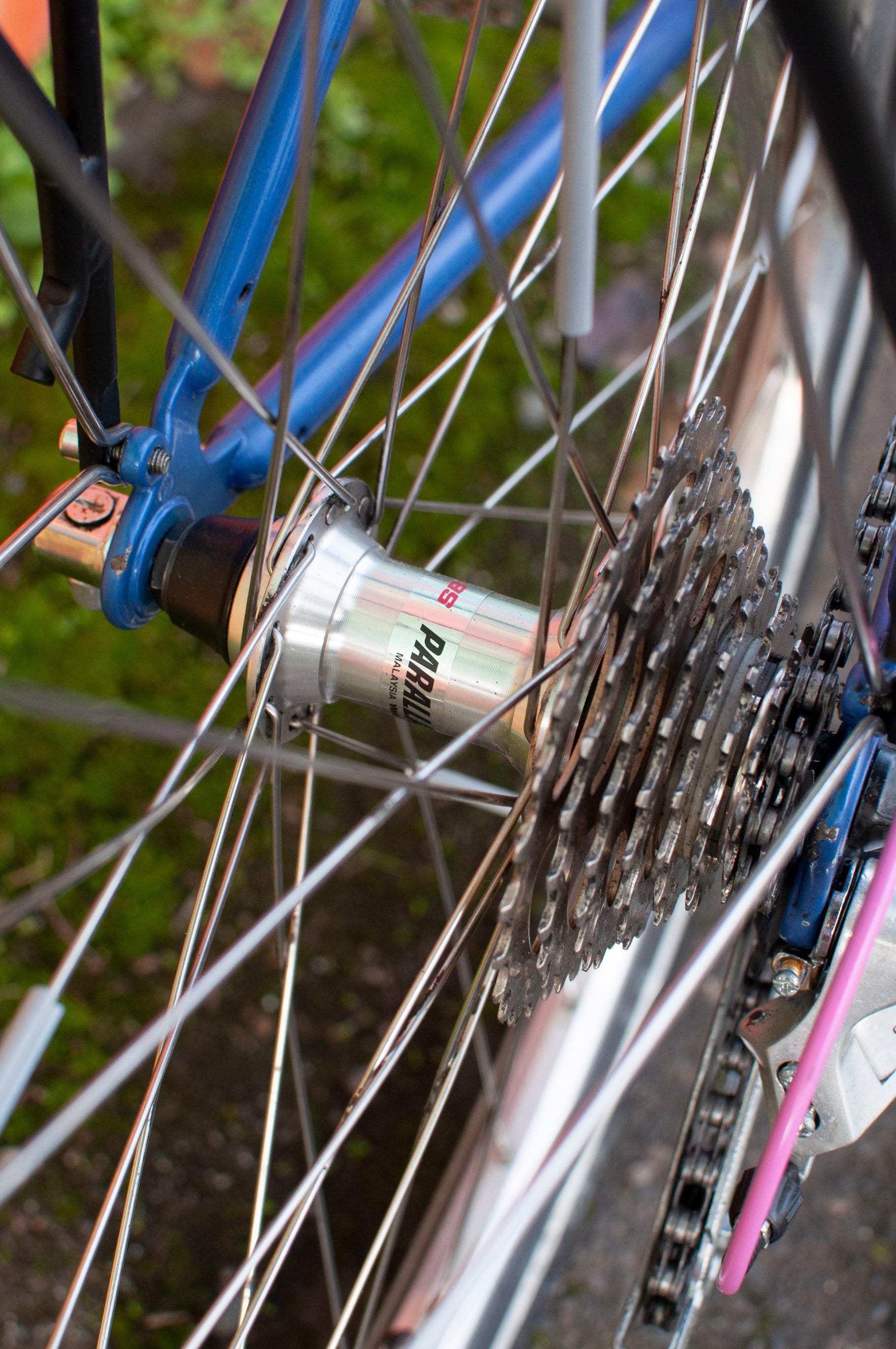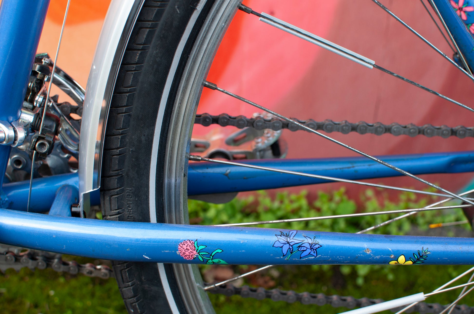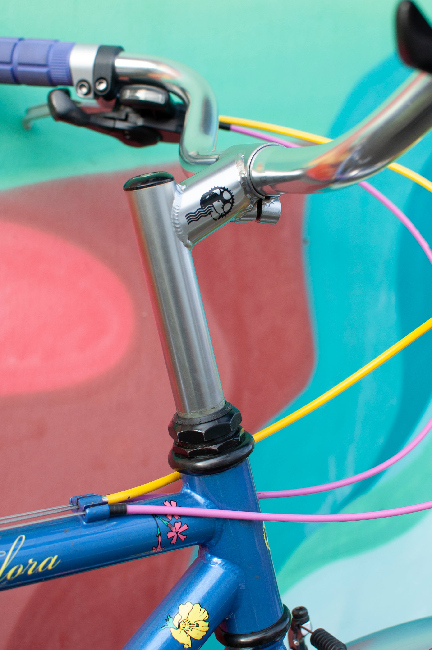Summer lovingly restored this one - ultrasonic cleaning of all original components, replacing whatever was worn out, and adding embellishments such as colorful cable housing, brake pads and grips to match the flowers on the bike, and aesthetically and functionally considered accessories to make it a comfortable and highly functional daily-rider bike, with a high-end, well-preserved vintage leopard print Georgena Terry Butterfly saddle, MKS lambda pedals, full coverage fenders for rain, King Cage "Iris" water bottle cage, and era appropriate rack to carry your belongings. You might want to customize a few things but it's pretty kitted out already!