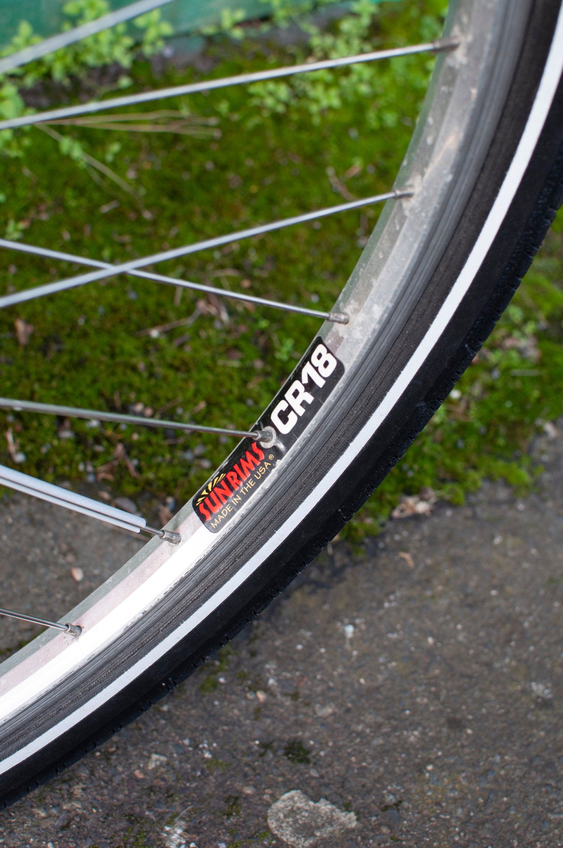 26in Sunrims aluminum rim brake wheelset with silver Shimano Parallax quick-release hubs.