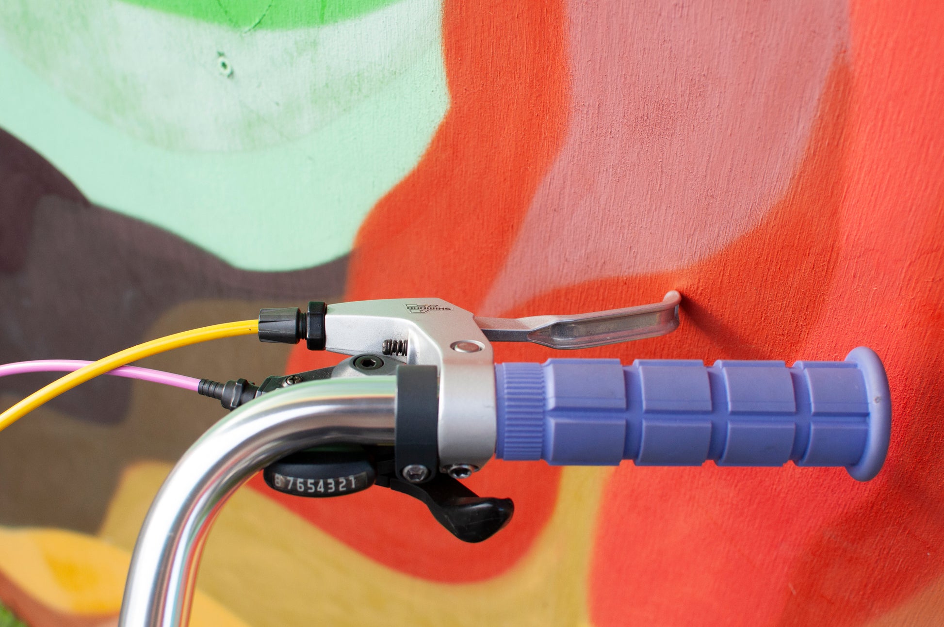 Shimano A Silver Linear Pull V-brakes and matching brake levers with new pink brake pads and yellow Jagwire cable housing to match the flower decals on the frame.