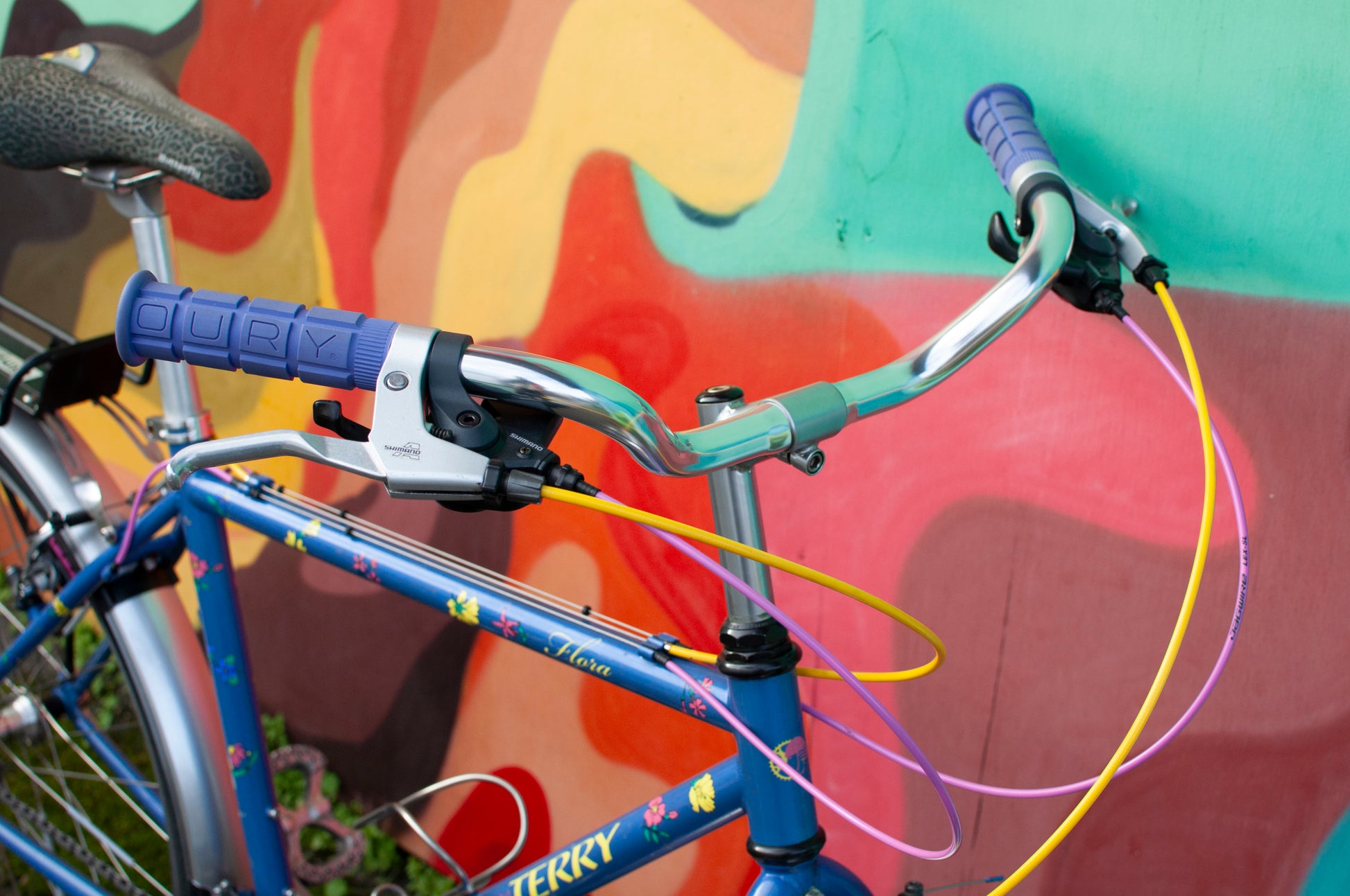 Vintage, late 90s steel hybrid bike by Georgena Terry, a true legend and pioneer in women's bikes. This bike, adorned with the bike's original flower decals, was treasured by it's previous owner, holding decades of stories of freedom and adventure, and comes with the original owner's manual. She entrusted us with it to ensure it's well-loved moving forward, so we put extra attention to detail into getting this one set up as a trusty daily rider. We'd like to keep this bike local, ensuring we can schedule a test ride and properly fit and adjust the bike to the next owner.