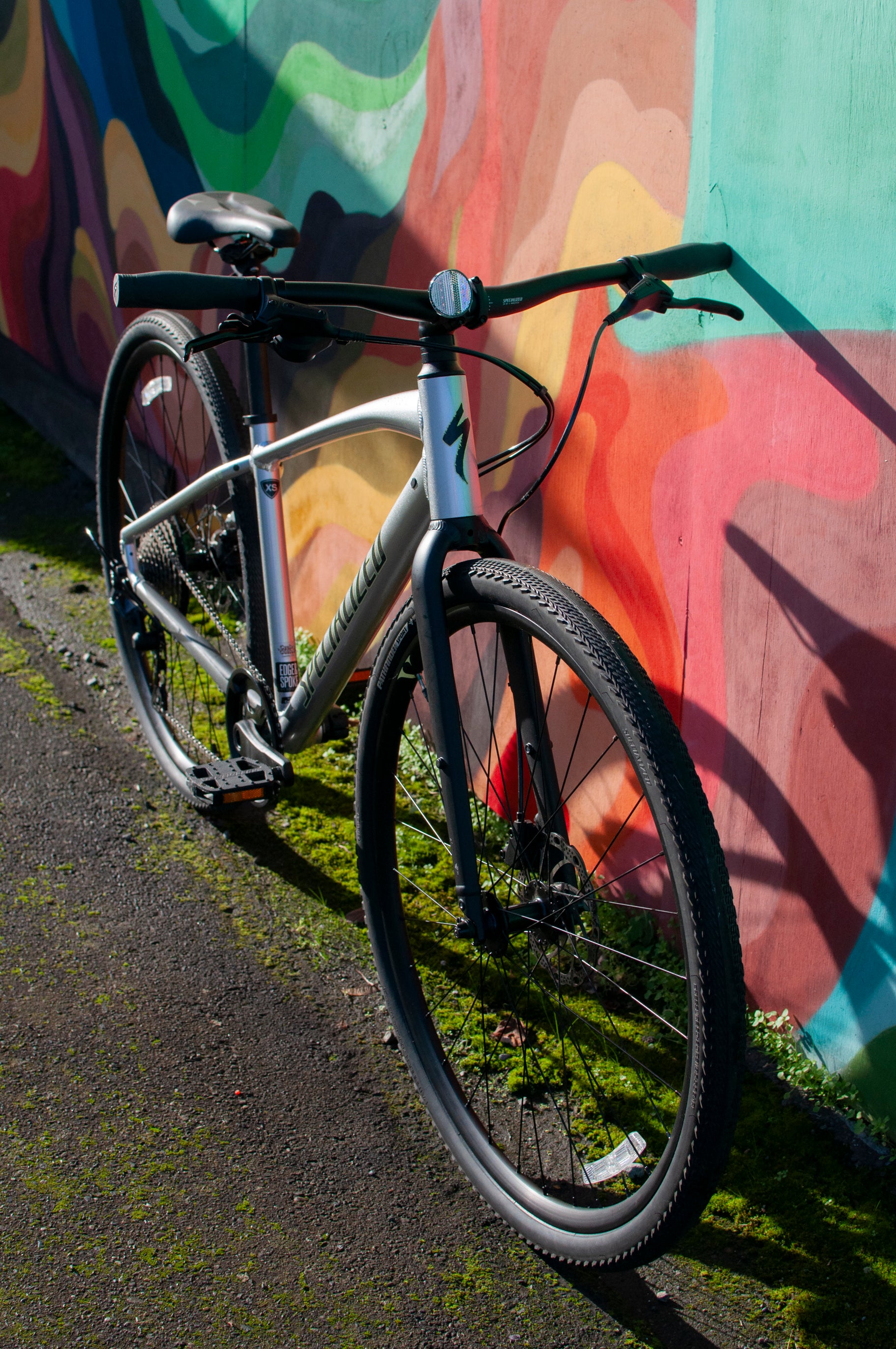 XS hybrid bike with disc brakes and refleclective elements for visibility in the dark. Aluminum bike with tektro hydraulic disc brakes, 1x10 drivetrain with Shimano Deore rear derailleur. 700x40c tires with room and mounting points for fenders, and mounting points for a rear rack or mini front rack. Flat bars with slight rise and sweep. Specialized grips, and comes with Specialized ergonomic saddle and platform pedals as well.