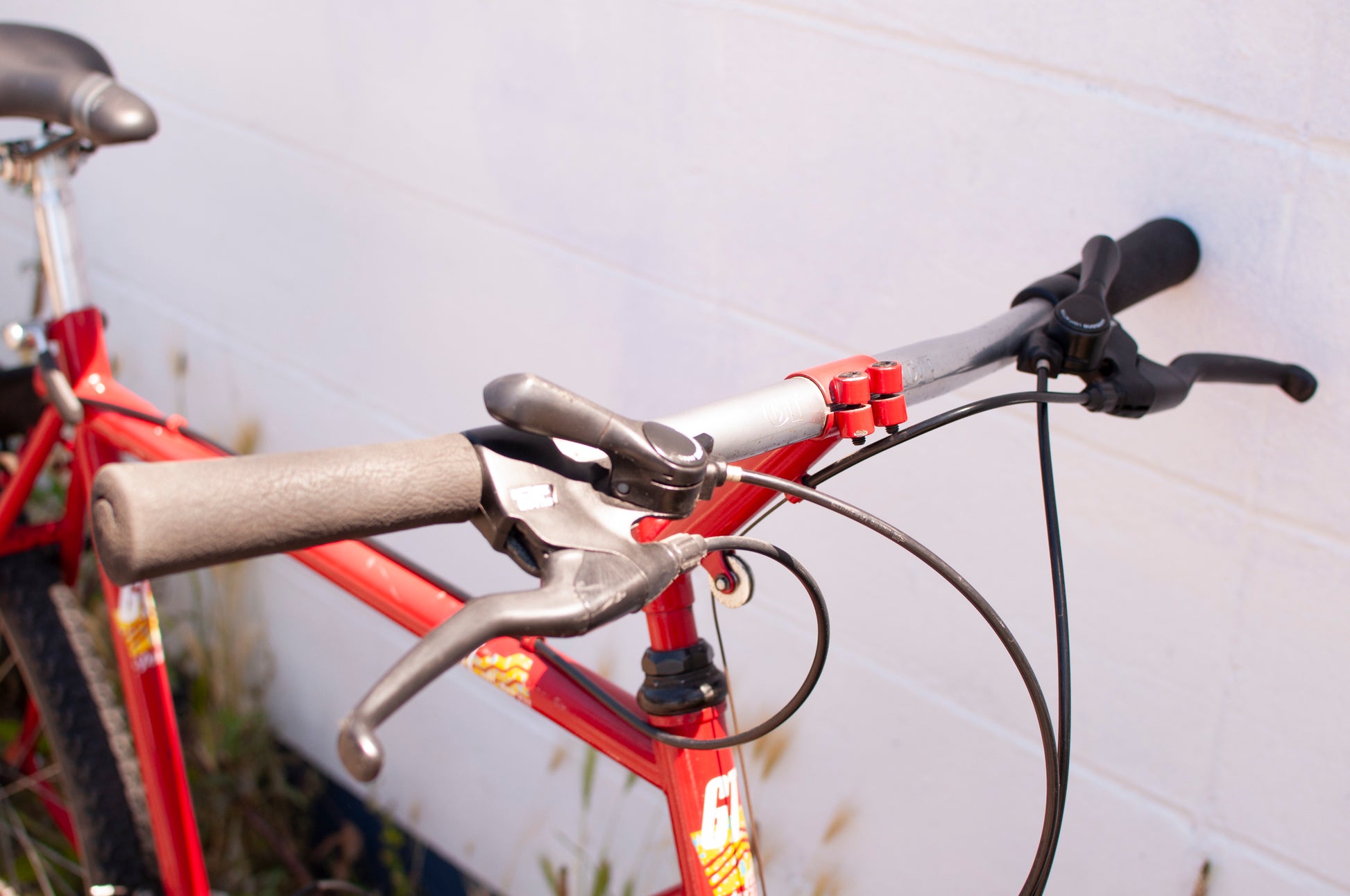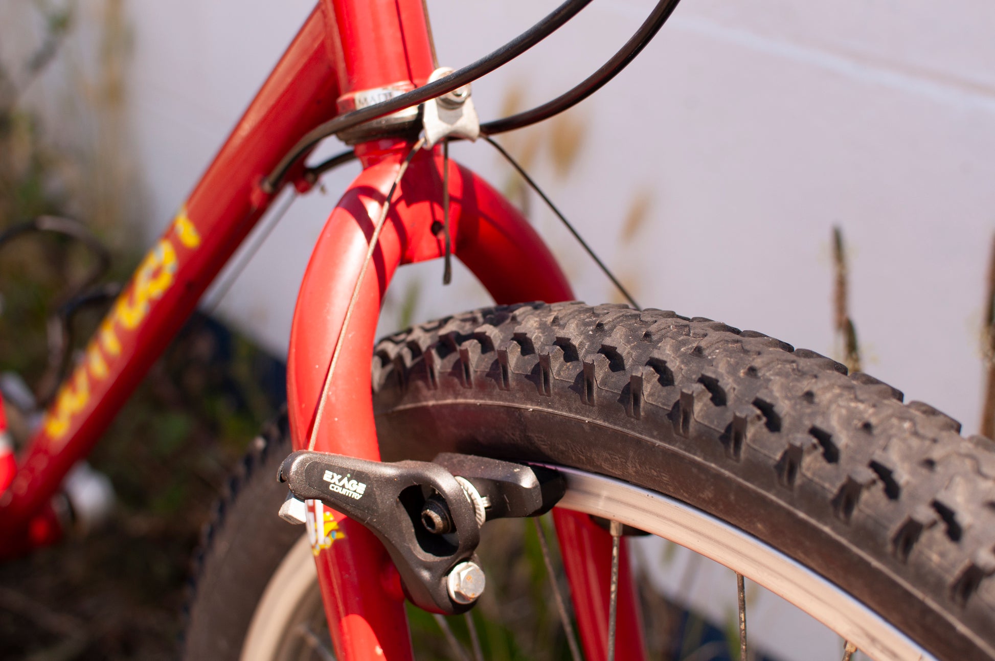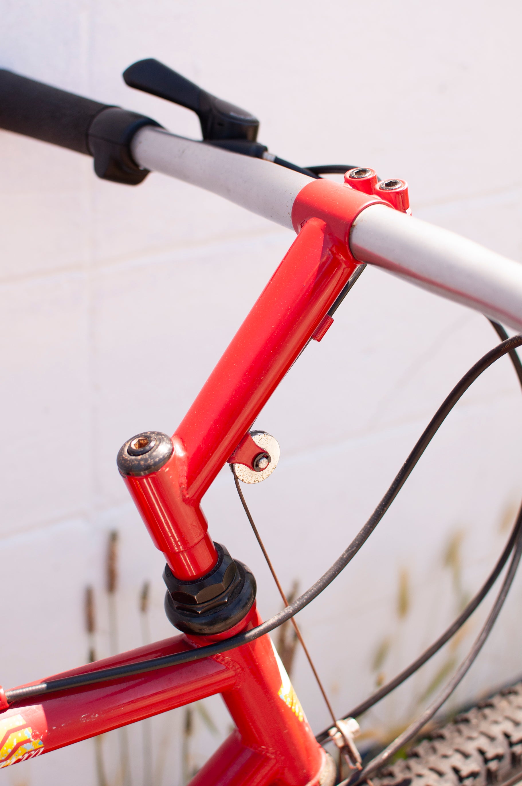 Original black headset, matching red stem wiht cable stop, silver GT wide bars with a slight backsweep. Black Shimano Exage country cantilever rim brakes and brake levers.