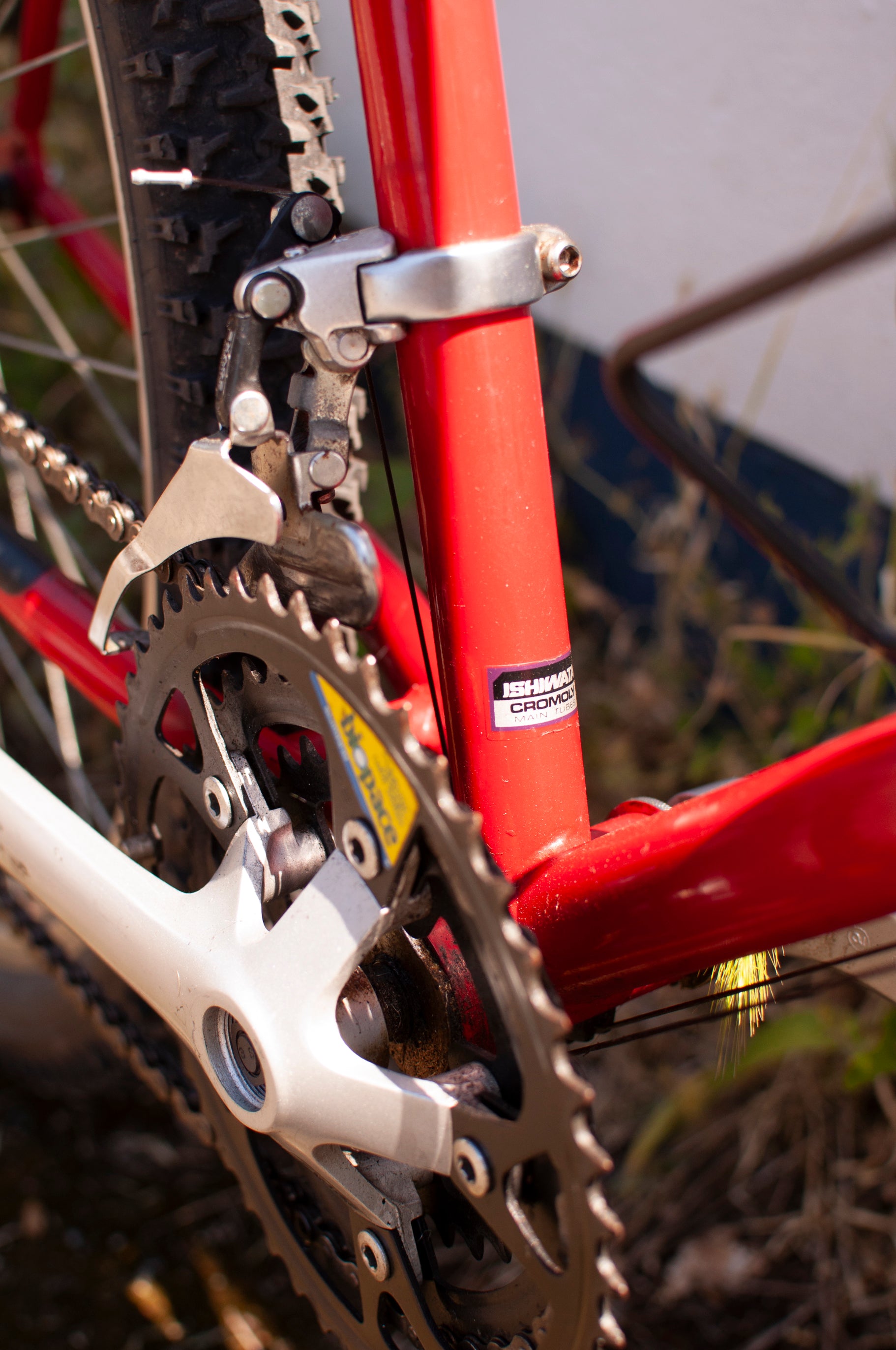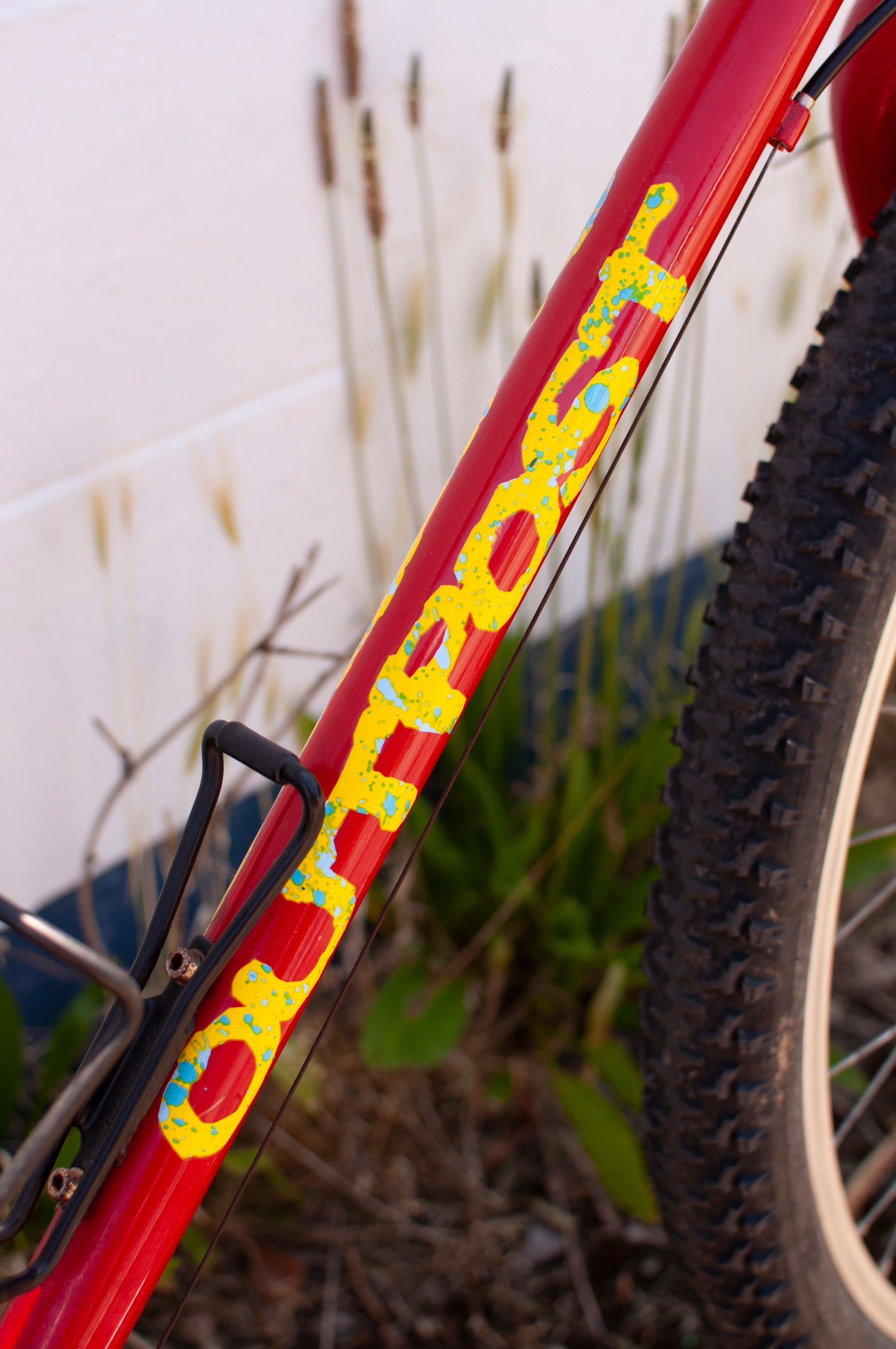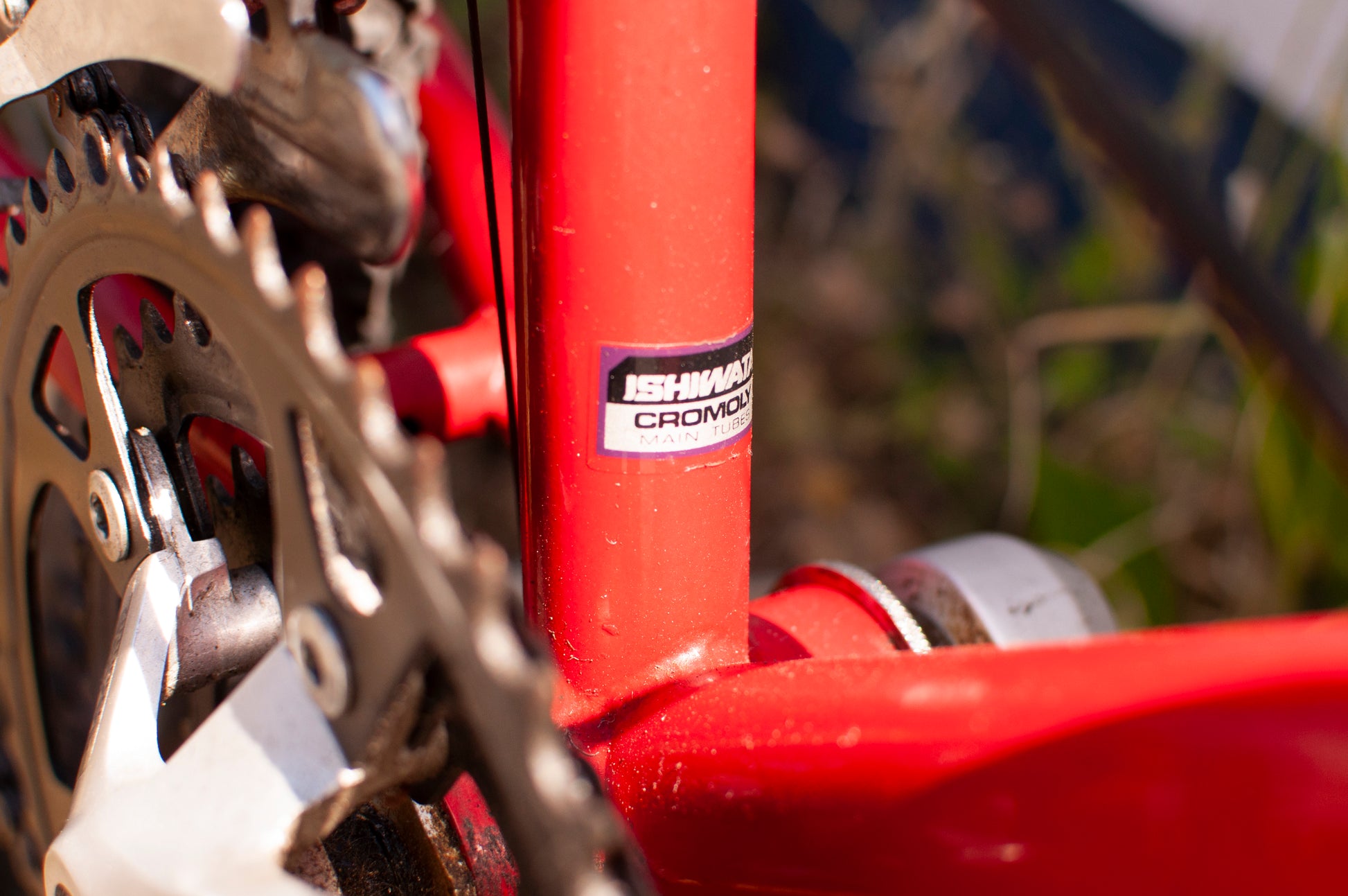 Ishiwata chromoly steel frame, made in Taiwan. Red paint with yellow and blue-green accents. Minor scuffs but no dents and little wear for its age.