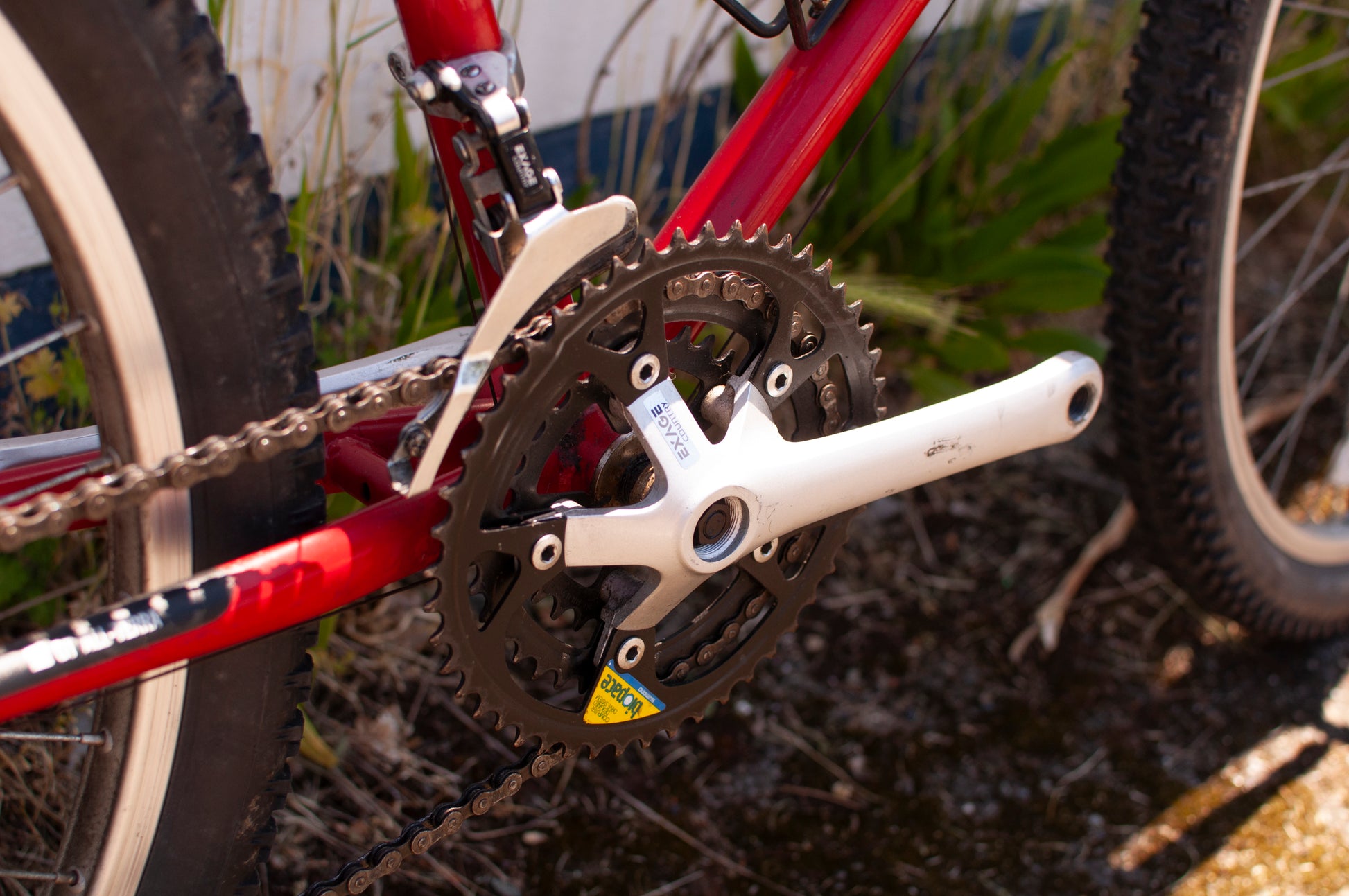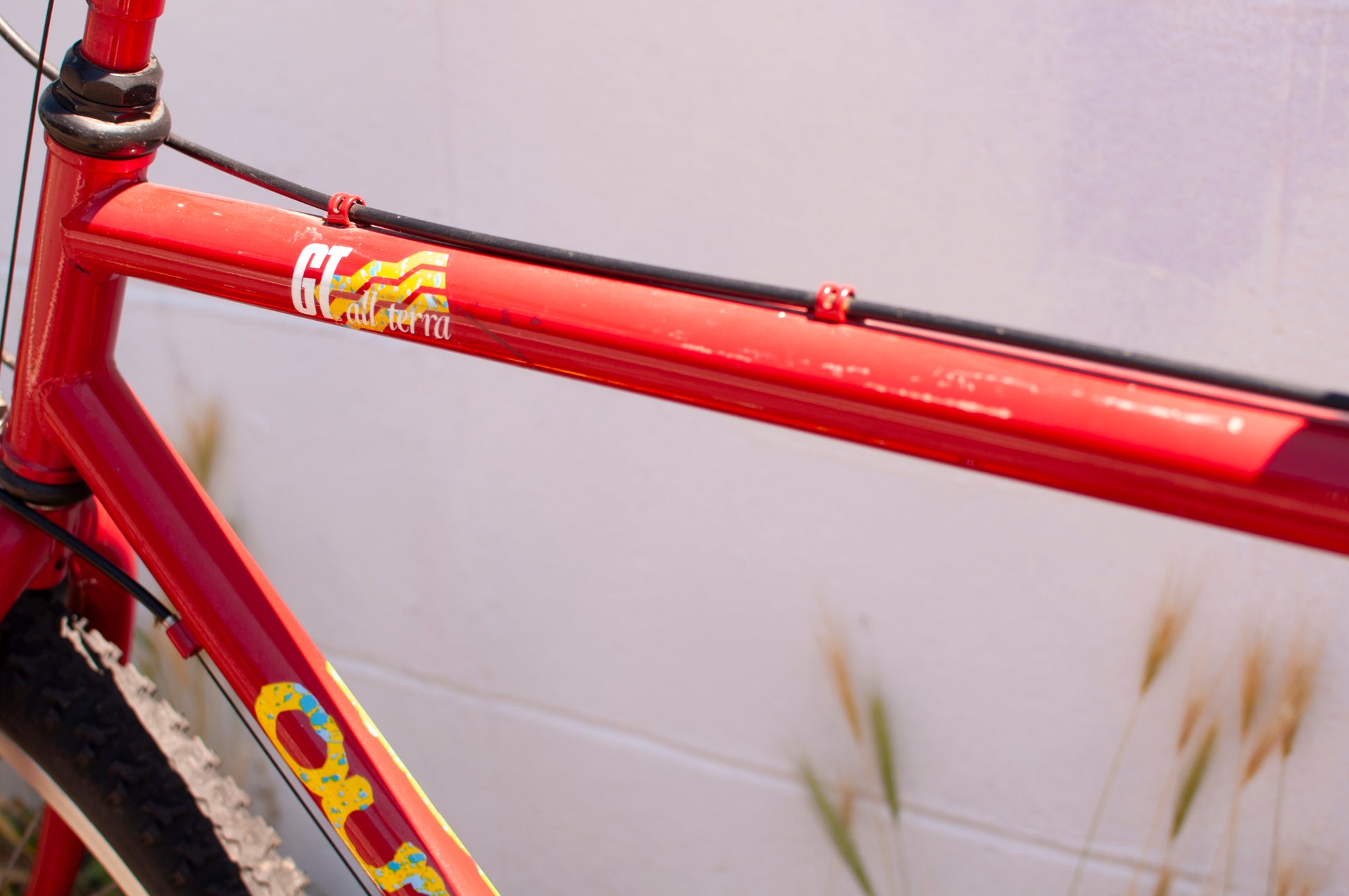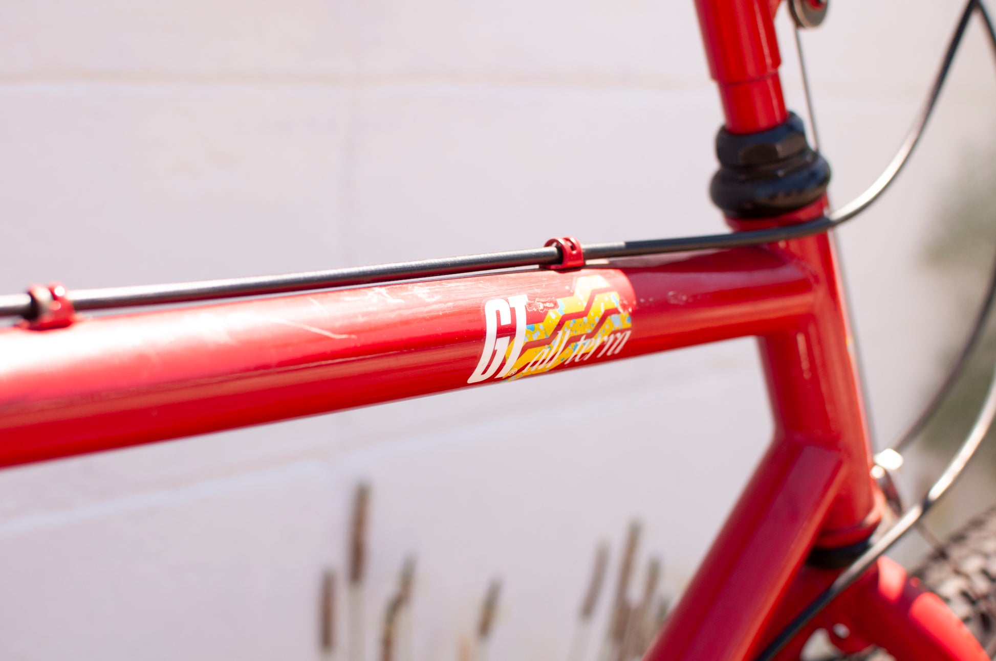 Ishiwata chromoly steel frame, made in Taiwan. Red paint with yellow and blue-green accents. Minor scuffs but no dents and little wear for its age.