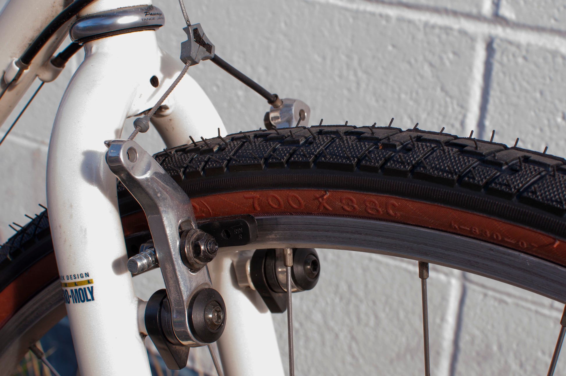 Original Kenda pro 700x38 hybrid tires with brown sidewall - they have all the tread left but will have a shorter lifespan than new tires due to their age/dryness.