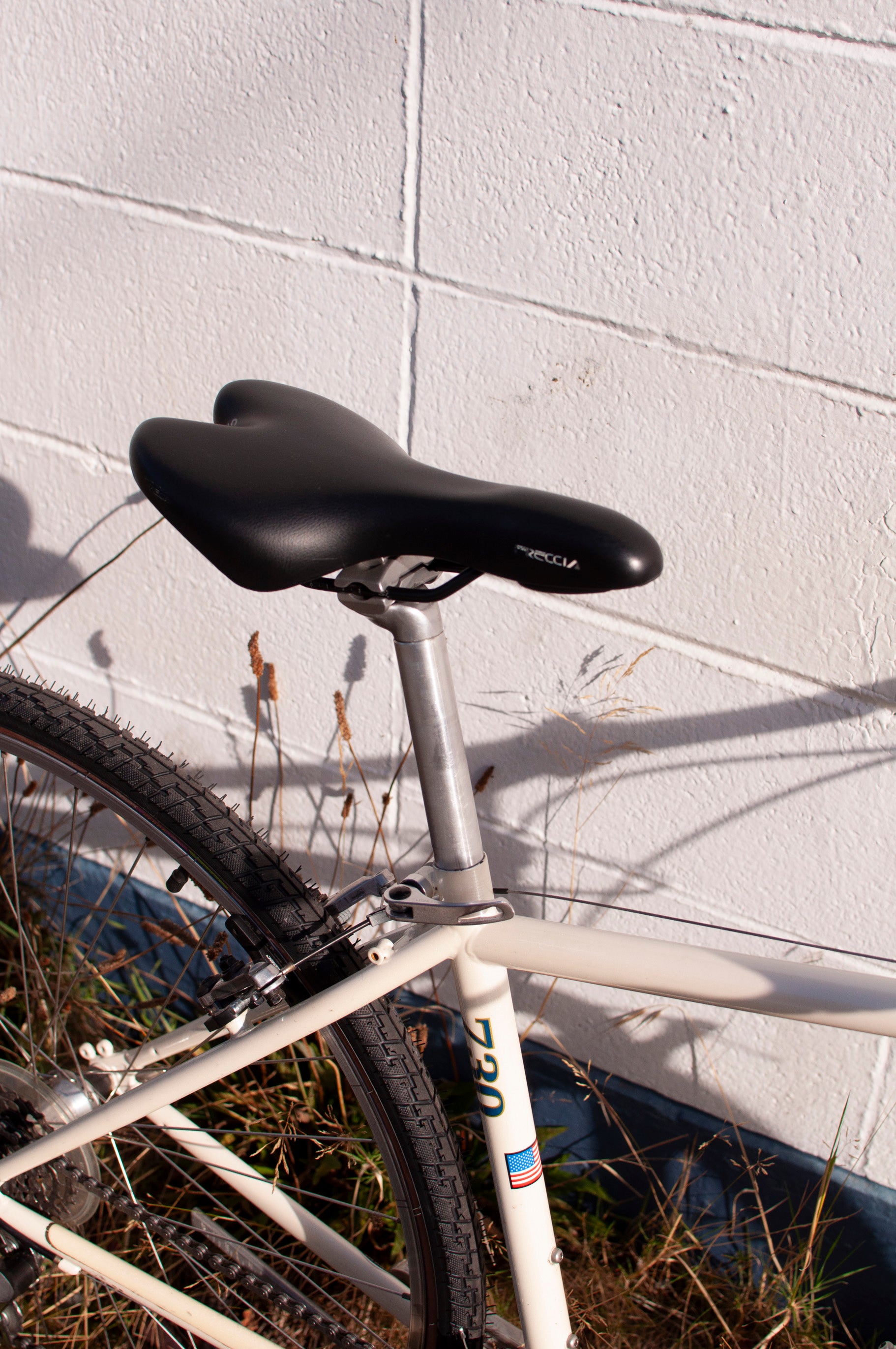 Durable steel frame 90s hybrid bike, making a great commuter/city bike that can take on some trails too. This bike was kept in excellent condition and barely ridden by the previous owner. We refreshed it with a full tune up, new brake pads, and a swapped in saddle.