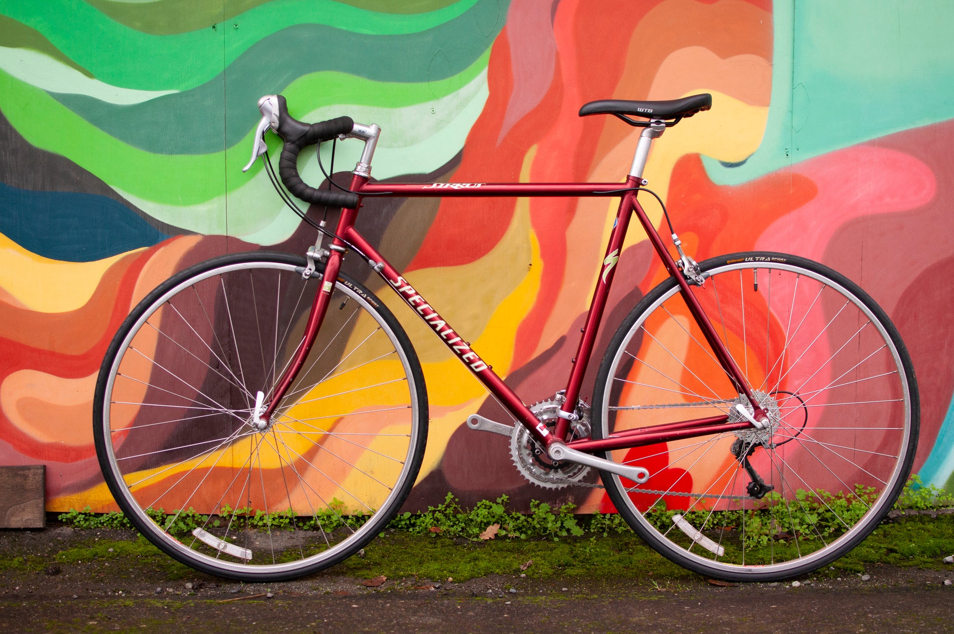 Chromoly steel road bike by Specialized, Designed in California and made in Taiwan. Shimano RSX groupset.