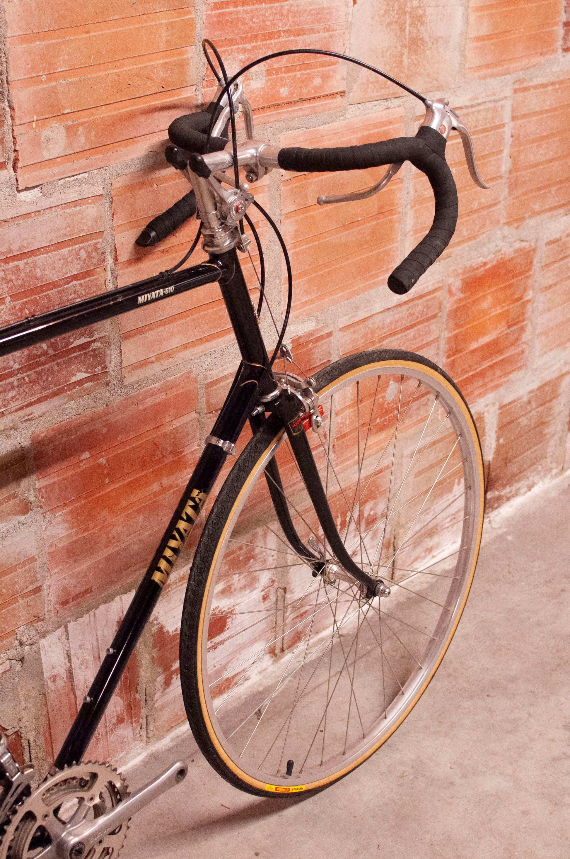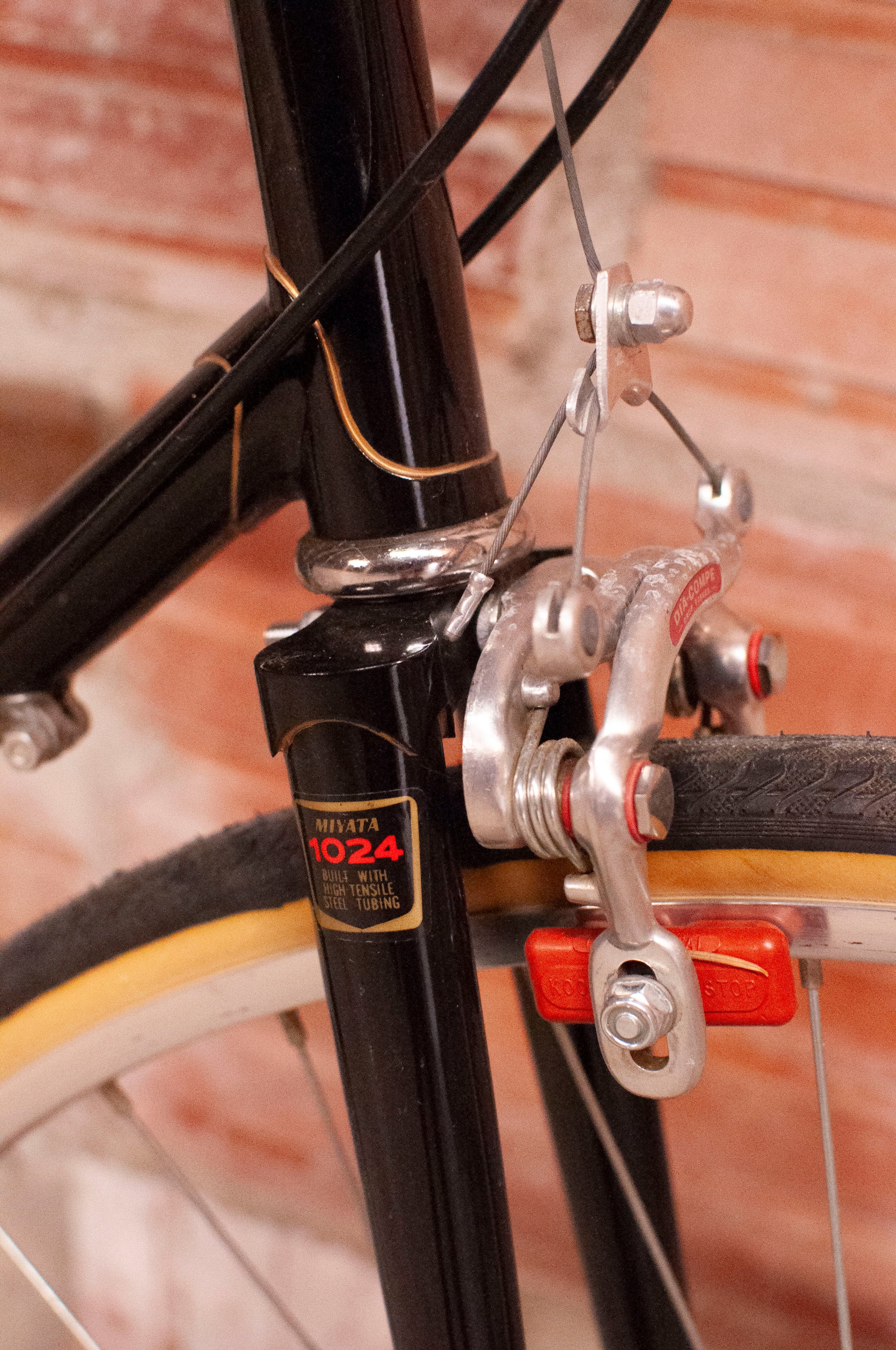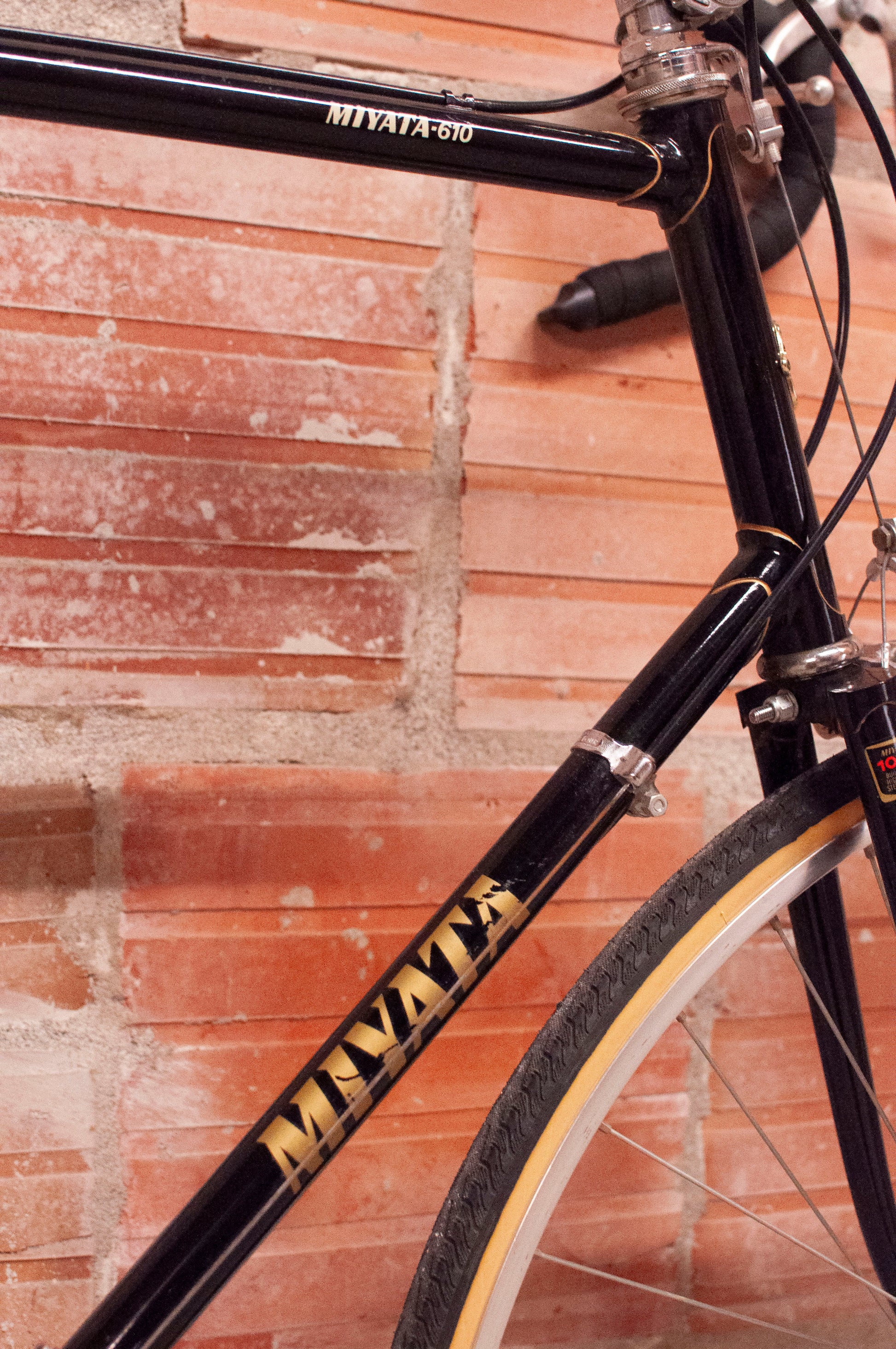 Beautiful and ready to ride vintage Miyata bicycle, black with gold and red accents. In good condition with minor imperfections in the paint. It's definitely for a tall rider, probably 6'2" and up, with a 63 cm frame. Good condition for a 1980's bike, kept in good shape by a collector.