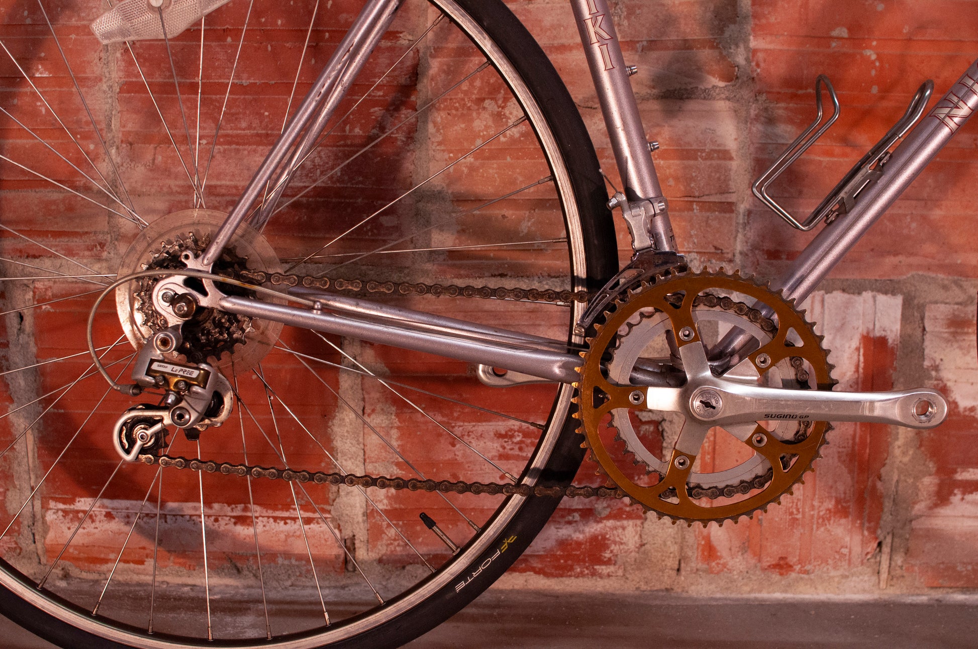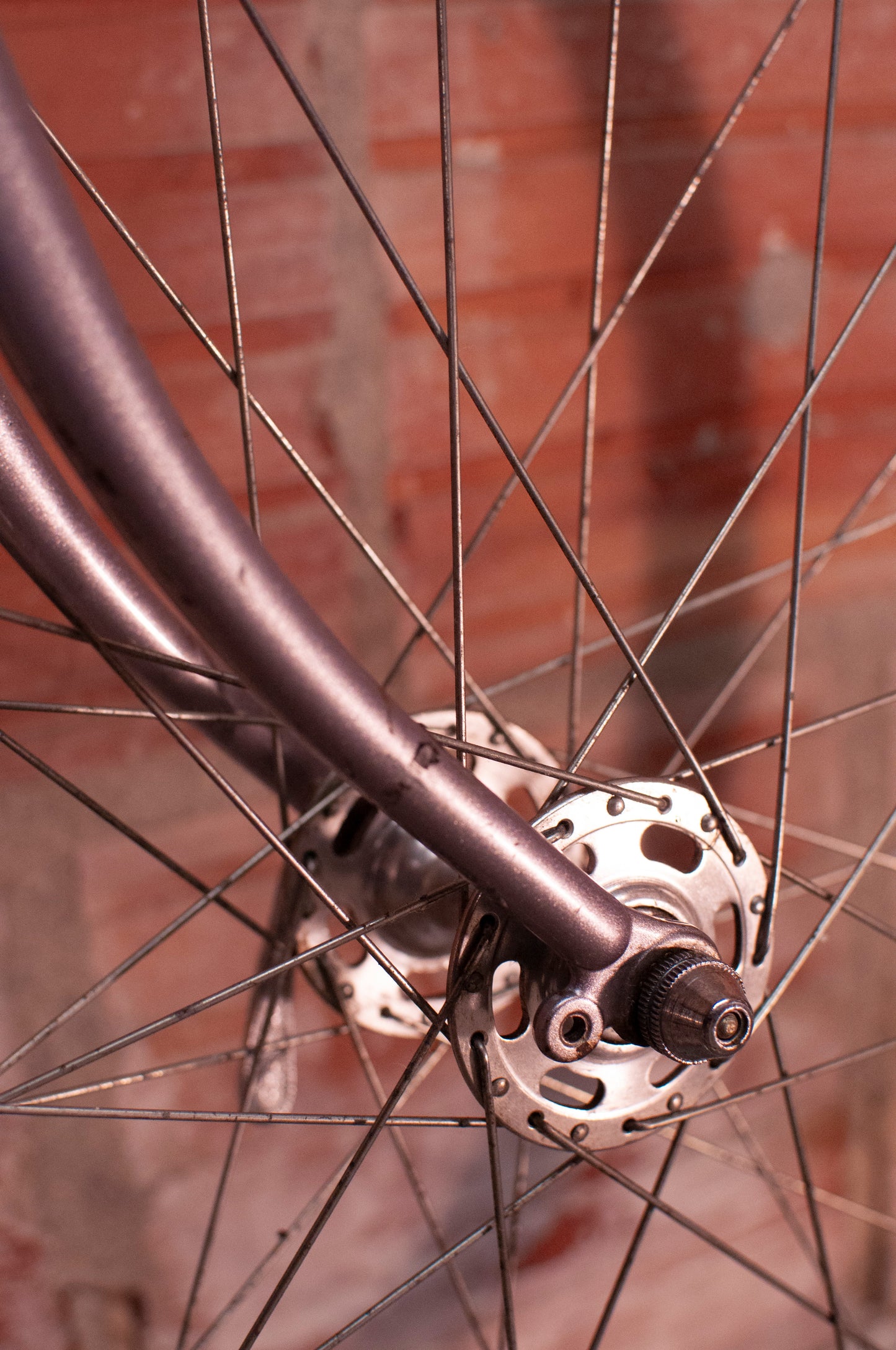 Lovely lugged steel Nishiki Road bike, made in Japan in the 1980’s, with Tange infinity Cr-Mo tapered double butted tubing, and a shimmery lilac paint job with plum and silver accents. Eyelets for front and rear racks and/or fenders. Bronze Sugino GP crank, Suntour LePree derailleurs and friction downtube shifters with a 2x6 drivetrain. Bronze Dia-Compe caliper rim brakes. Mismatched wheels, with a silver Araya rim & Suzue hub in the front, and a bronze-black Araya rim & Sansin hub in the back. 27x1.25” Forté Strada St puncture resistant tires.