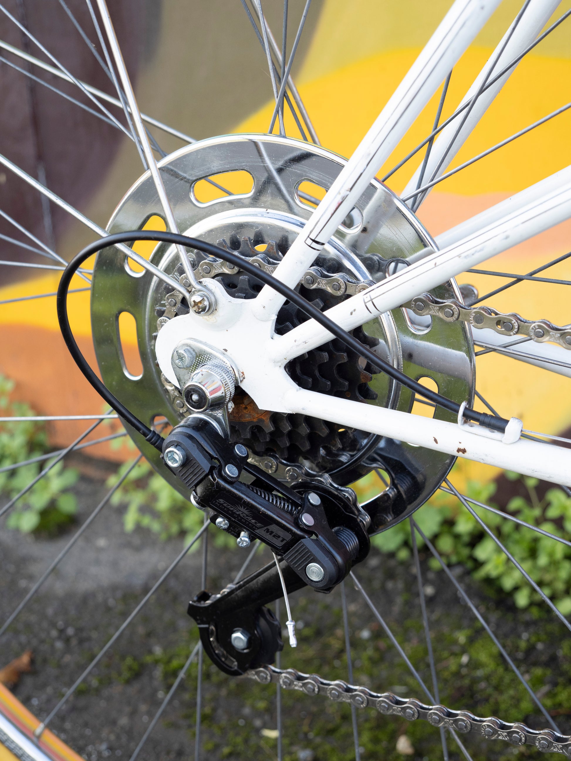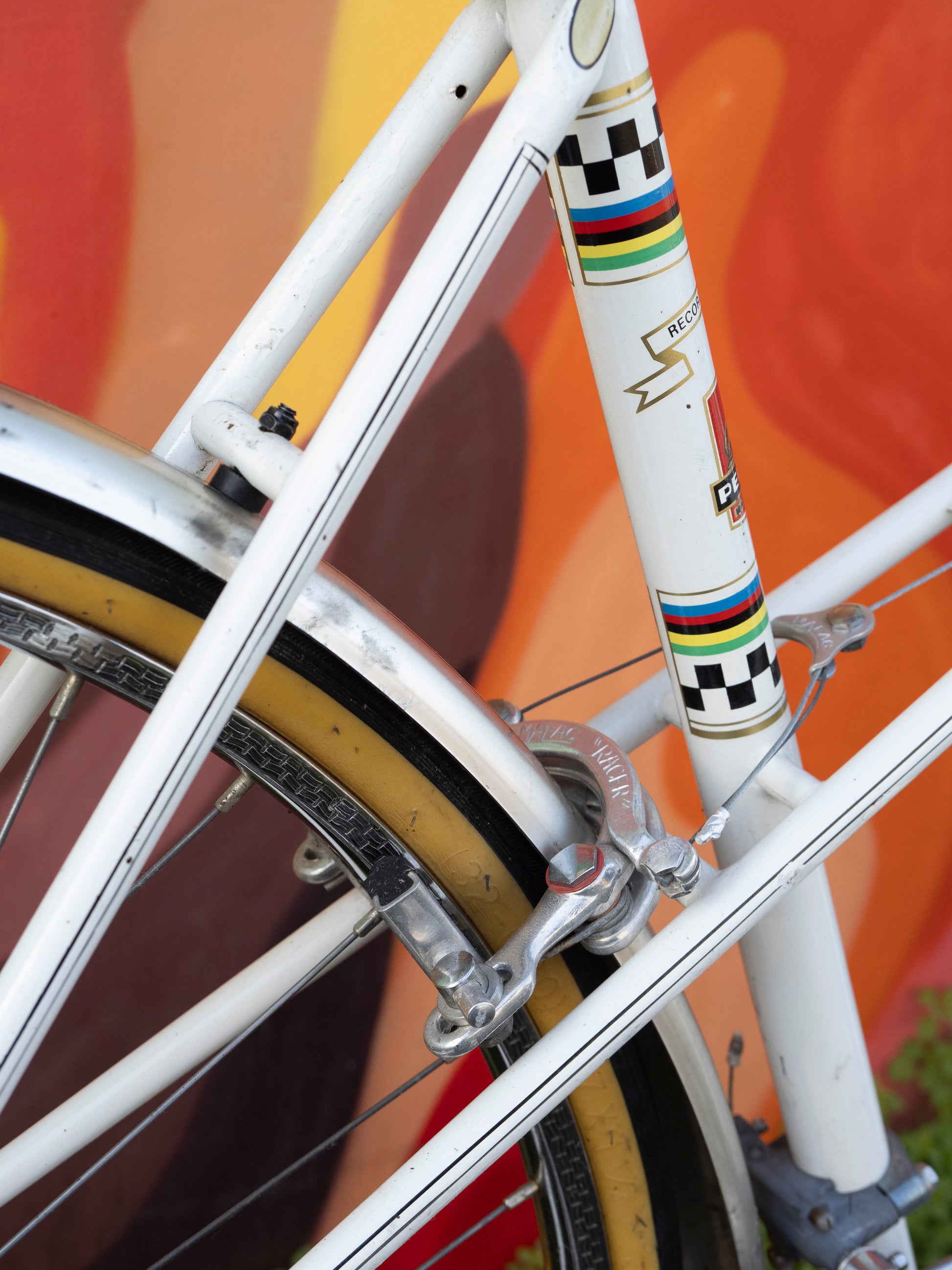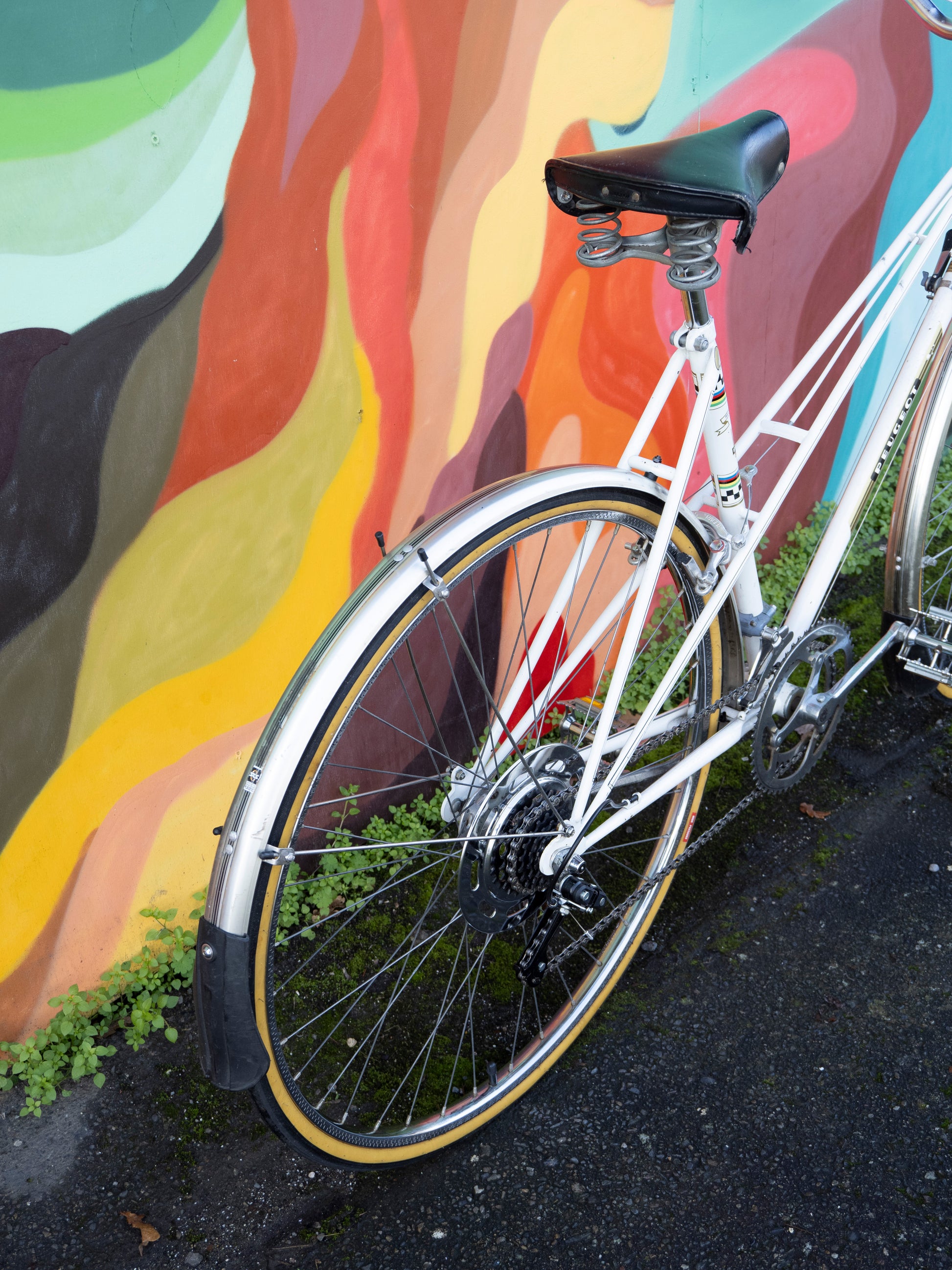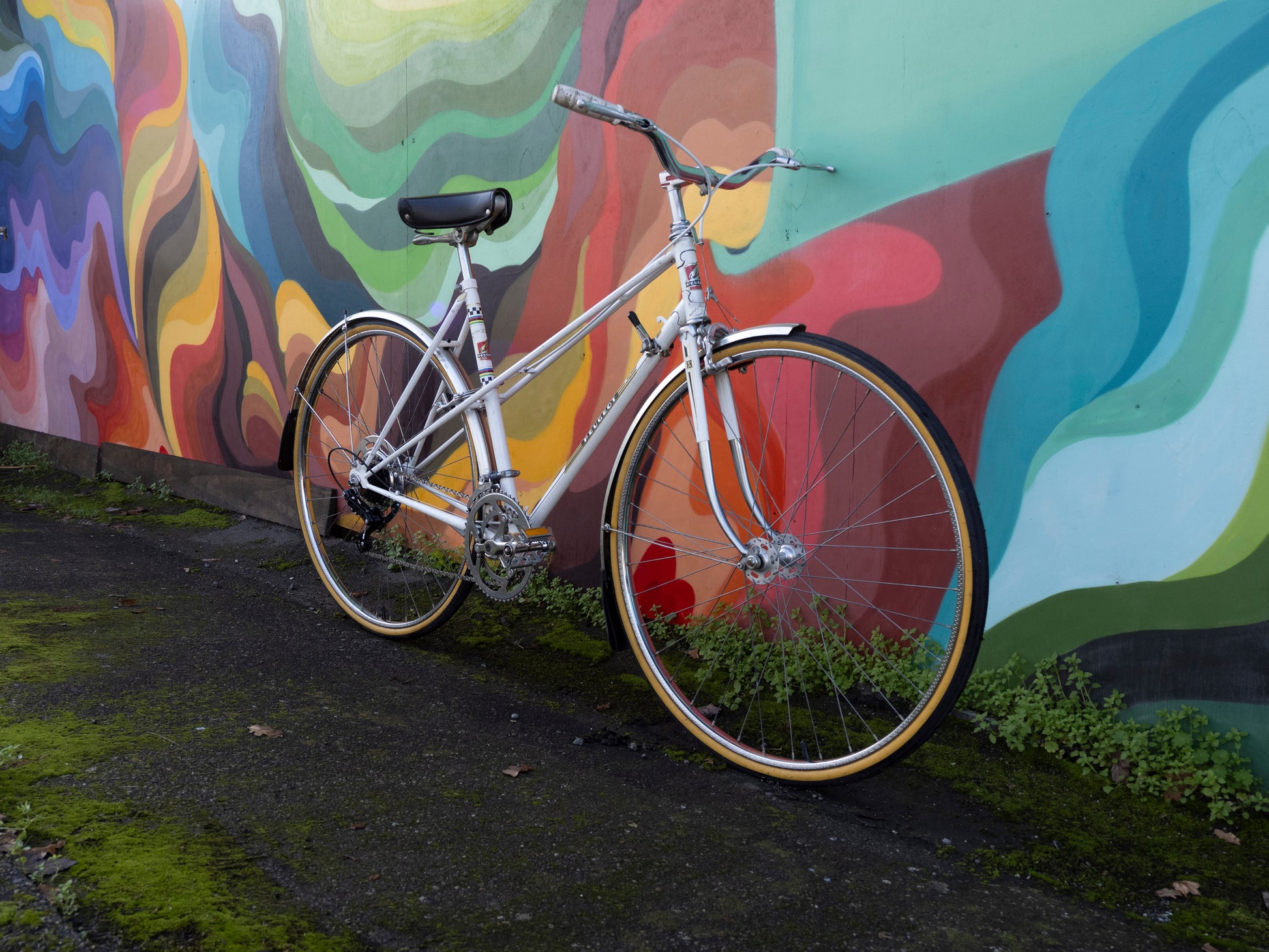 Classic vintage Peugeot 53 cm steel mixte road bike, made in France. White paint job with black, gold, and red detailing and a classic Peugeot branding and accents. Rigida Chrolux 27x1 1/4" wheels, Made in France, with unique textured rim detailing and glossy chrome look. Slight sweep-back riser handlebars, Simplex downtube shifters, Mafac "Racer" caliper rim brakes, and a black leather original Peugeuot seat with spring suspension. 2x5 speed, Sunrace M2T rear derailleur, Simplex front derailleur. The mixte step-through design, complete with fenders and a kickstand gives this bike a comfortable feel. It's an old bike; frame is a bit scratched up and handlebar grips could use a refresh but it rides smooth. If you're interested in this bike and want to do an overhaul to restore it and modernize the parts, we can definitely help with that.