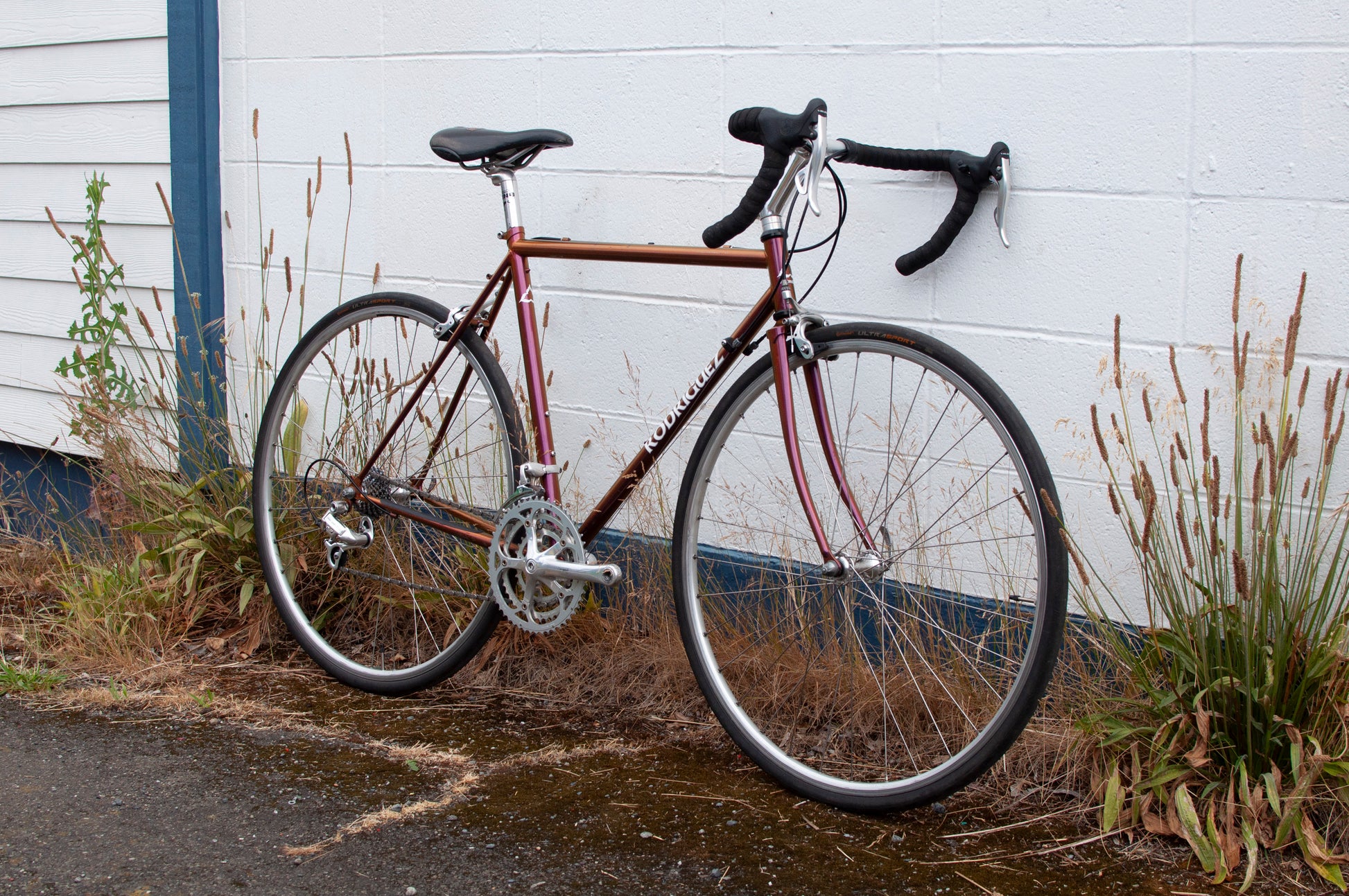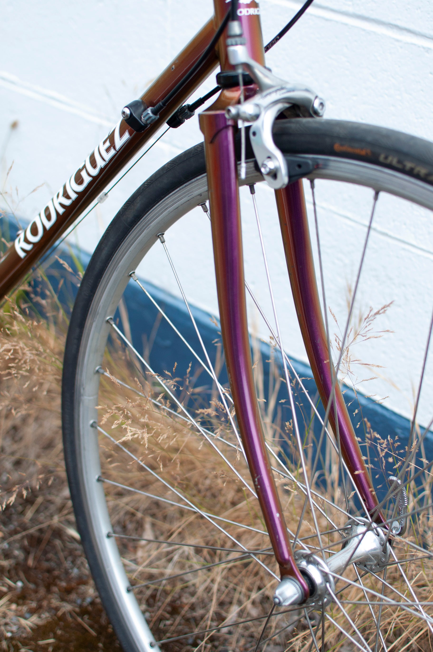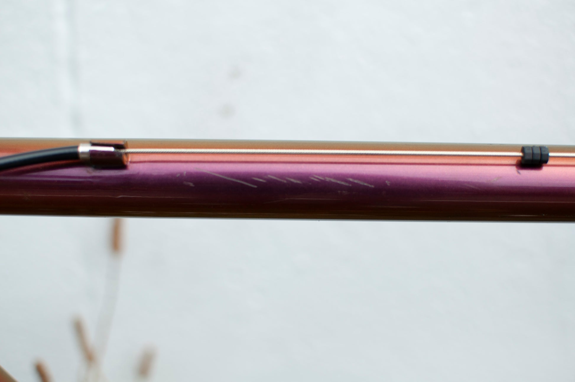 Made in Seattle, WA, USA steel frame with Ritchey dropouts, with some scuffs on the paint but no severe wear. Made by Rodriguez/R&E Cycles with a custom iridescent purple paint job.