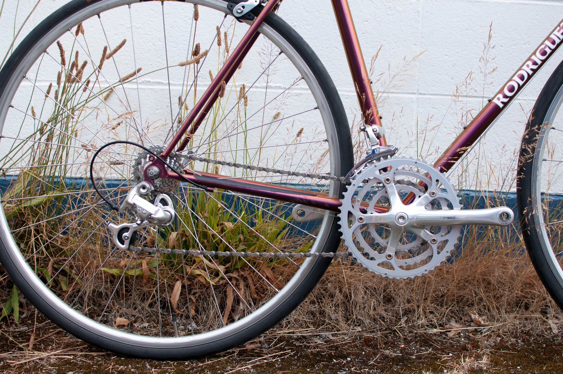 3x9 Campagnolo Veloce drivetrain (crankset, cassette, derailleurs, brifters) and matching Campagnolo Veloce caliper rim brakes and Campy hubs. Geared for speed and for climbing hills.