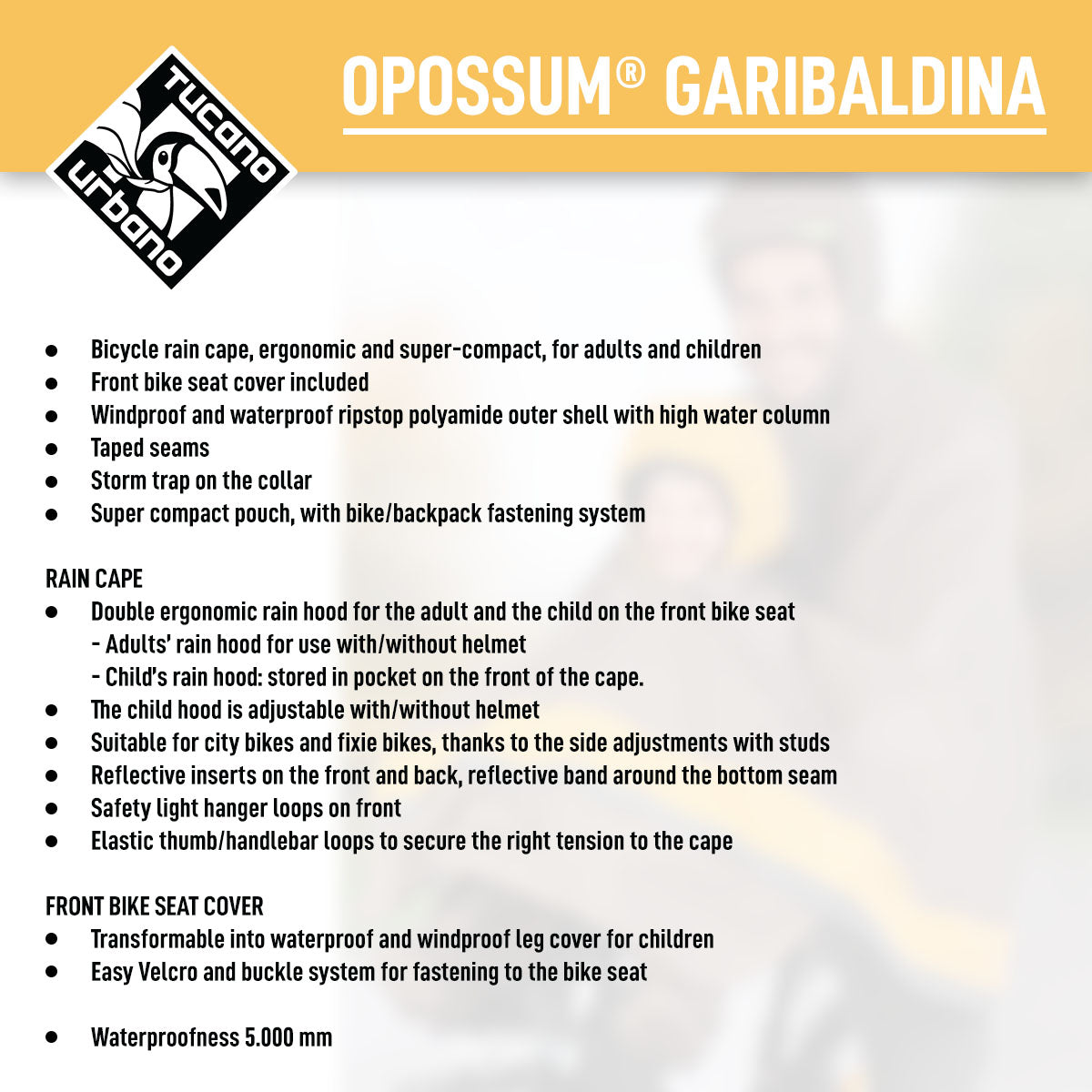 Tucano Urbano GARIBALDINA OPPOSUM is a double ergonomic rain hood, designed to protect an adult as well a kid traveling on front bike seat in cold, windy, or rainy weather. Front bike front seat cover is included.